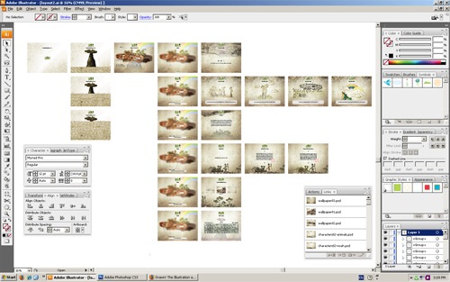 I thought too many colors for the title just felt redundant; sure people think of vibrant colors when you have the title such as 'Rainbow' but what's important is we have a logo that's harmonious with the overall design. Besides we're already subconsciously thinking of all the hues upon ushering that word. Deep in my heart I believe this logo is perfect! The green is a natural variation of green that compliments the overall palette I've set. Created the title-page without the blue effects, just to see if it looks alright overall... does it? I cannot tell, my eyes just saw a zipper on the night sky opening up and I aint' on crack (yet). The storyline, has about four panels to illustrate for this section alone and I think I'm dead meat if I don't do it by next evening. Based on the feedback, I have managed to make a few amendments to the characters section, I'm streamlining the grid as much as possible to save time and space and will be incorporating it to the rest of the interface. That's all I can put up for now I need to go to bed. I wish we had more than two weeks to execute this but maybe... I'm beginning to suspect that's a hidden motive (time-wise) behind this project. Almost done now..